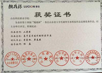今年6月,團委學生處(思政部)組織參加了由團省委、省教育廳、省科技廳、省科學技術協會聯合主辦的第十四屆“挑戰杯” 山東省大學生課外學術科技作品競賽。近日,比賽結果揭曉,我院信息工程系楊磊老師被評為優秀指導教師;信息工程系索美松、單春燕同學的《基于藍牙技術的防丟U盤》榮獲二等獎。