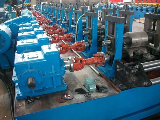 該生產線是以PLC觸摸屏人機界面為操作系統,基本工藝流程有上料、開卷、校平、送料、沖孔、冷彎成形、定尺切斷、收料等,設備主要組成部分有動力開卷機、牽引校平機、伺服送料機、液壓沖孔機、成形主機、無毛刺飛鋸切斷機、自動收料機、電氣控制系統,重量達20噸。