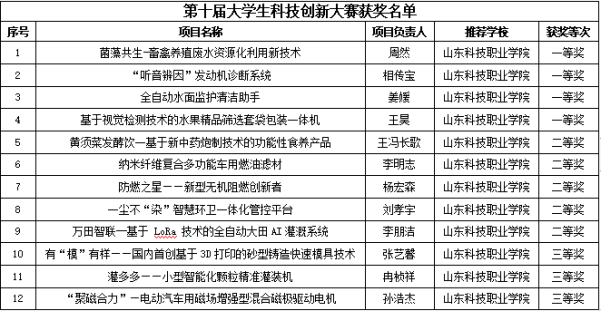 近日,山東省教育廳公布了第十屆山東省大學生科技創新大賽獲獎名單,學校獲一等獎4項、二等獎5項,三等獎3項。金獎、銀獎獲獎數量居全省高職院校第二,實現我校近幾年在該項賽事中獲獎新突破。