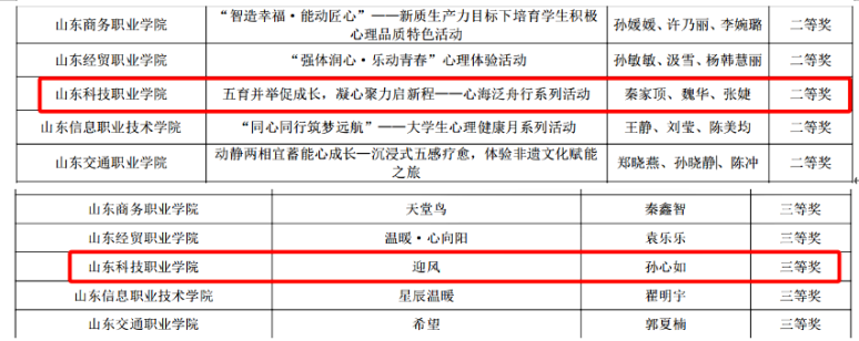 在2024年山東省高校心理健康教育月展示活動中,我校師生報送的作品《五育并舉促成長,凝心聚力啟新程——心海泛舟行系列活動》榮獲2024年山東省高校心理健康教育月展示活動特色活動賽道二等獎,作品《迎風(fēng)》榮獲2024年山東省高校心理健康教育月展示活動三行詩賽道三等獎。