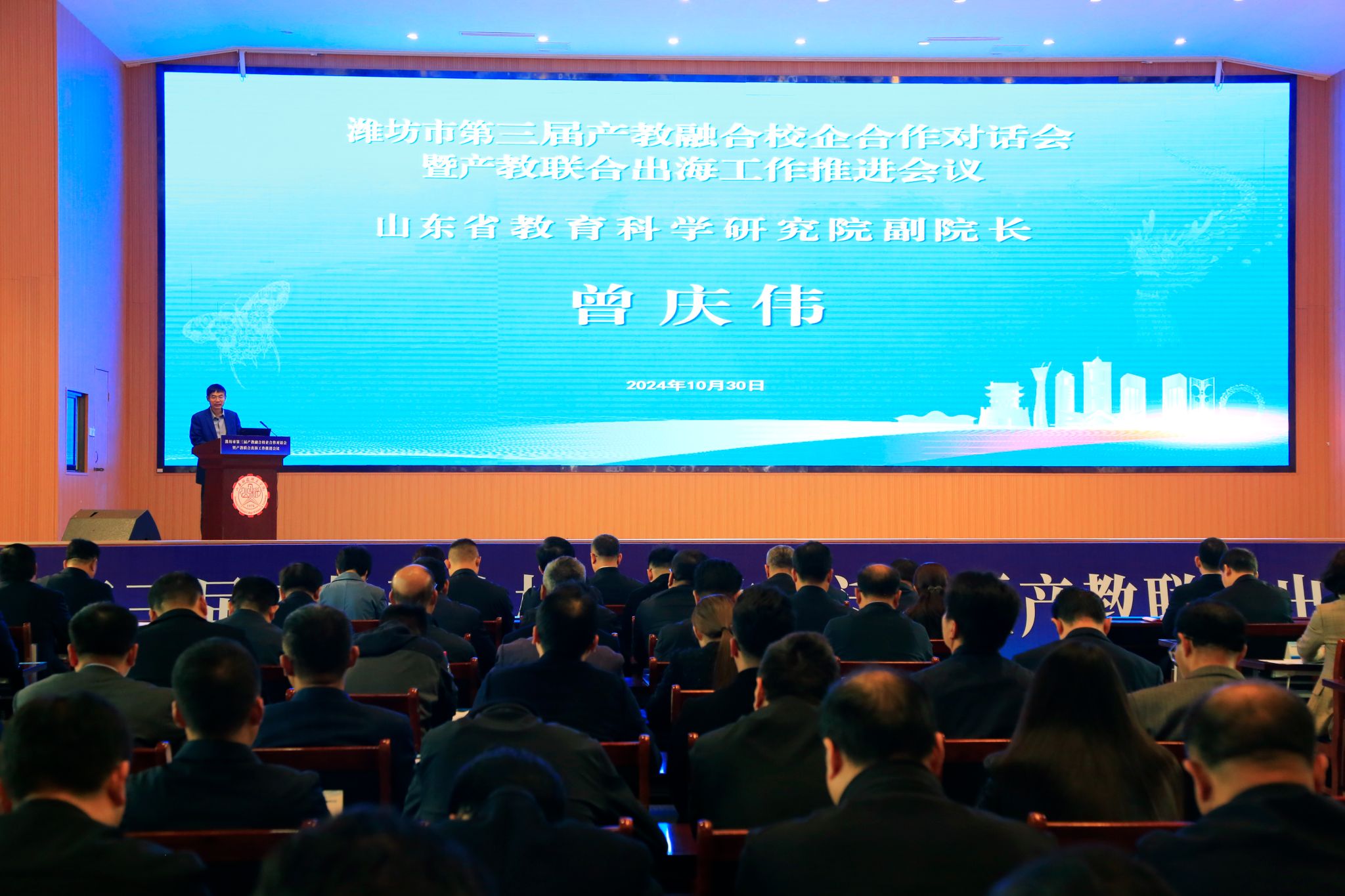 市委常委、宣傳部部長(zhǎng),市委教育工委書記楊建華及山東省教育科學(xué)研究院副院長(zhǎng)曾慶偉出席會(huì)議并致辭。會(huì)議由濰坊市副市長(zhǎng)、市工商聯(lián)主席陳端梅主持,17個(gè)縣市區(qū)分管領(lǐng)導(dǎo)、16個(gè)縣市區(qū)教體局、22個(gè)市直有關(guān)部門單位、35所駐濰院校、7所研究機(jī)構(gòu)、10所產(chǎn)教融合研究院及分院、73家企業(yè)等200余人參會(huì)。