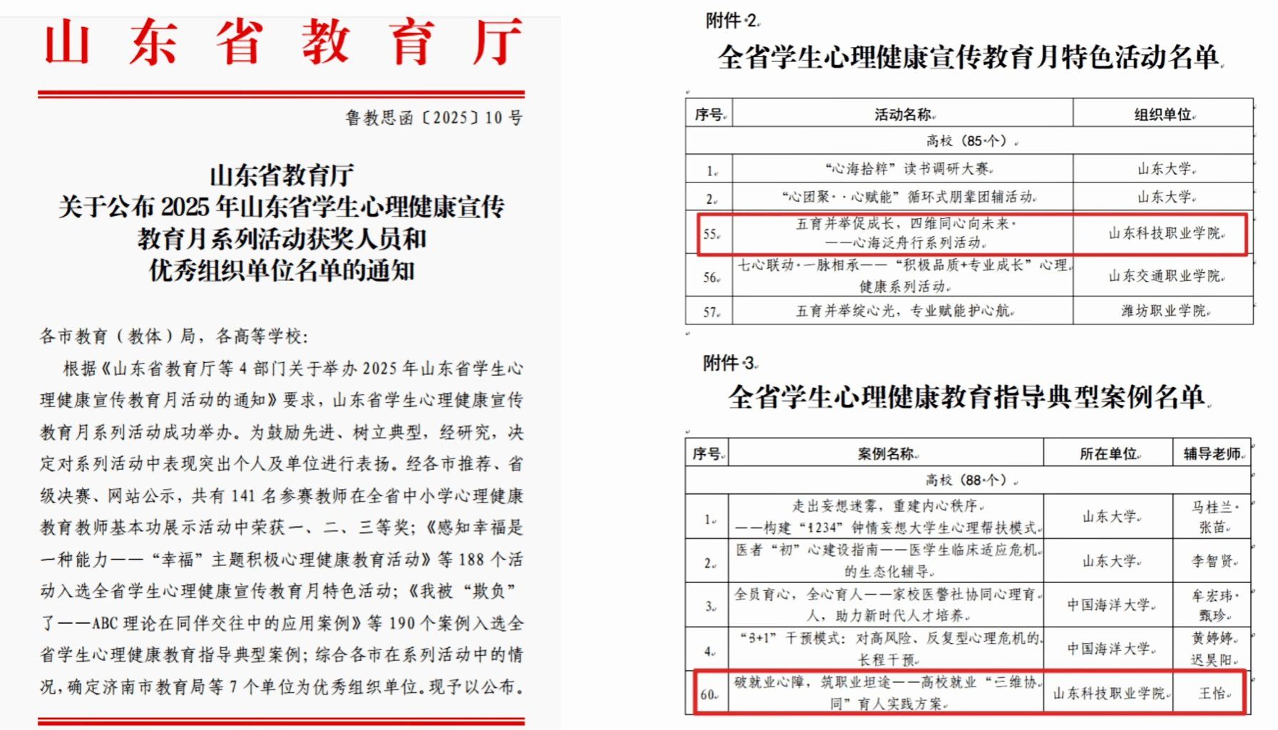 近日,山東省教育廳發(fā)布《關(guān)于公布2025年山東省學(xué)生心理健康宣傳教育月系列活動獲獎人員和優(yōu)秀組織單位名單的通知》(魯教思函〔2025〕10號)。我校師生表現(xiàn)出色,共有2項(xiàng)作品獲獎,充分體現(xiàn)了學(xué)校在學(xué)生心理健康教育及心理學(xué)學(xué)科育人方面的扎實(shí)工作和顯著成效。
