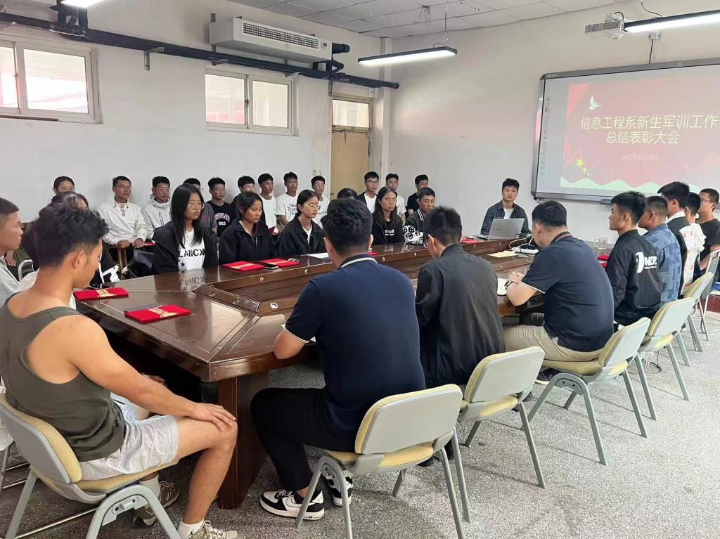 9月28日中午,信息工程系2023級新生軍訓工作總結表彰會議在博學樓B309舉行。系黨總支副書記主持會議并講話,系部全體2023級新生導航員、輔導員代表40余人參會。