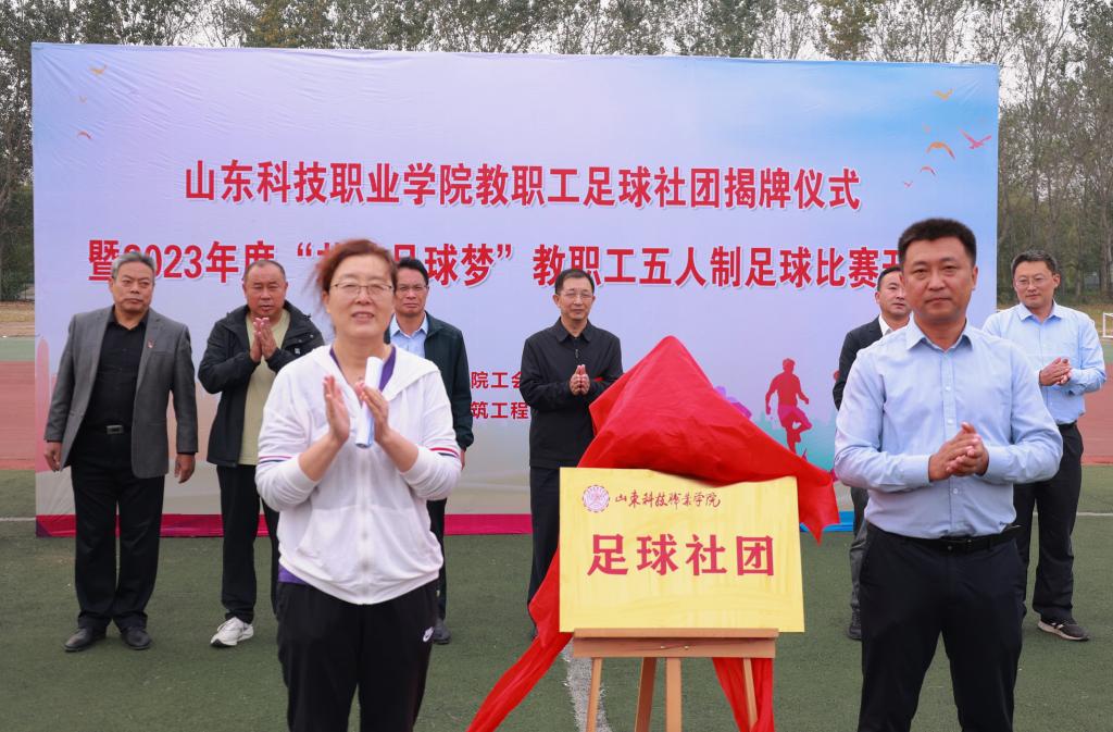 學院工會主席和教職工足球社團團長為社團揭牌。足球社團團長做表態發言。