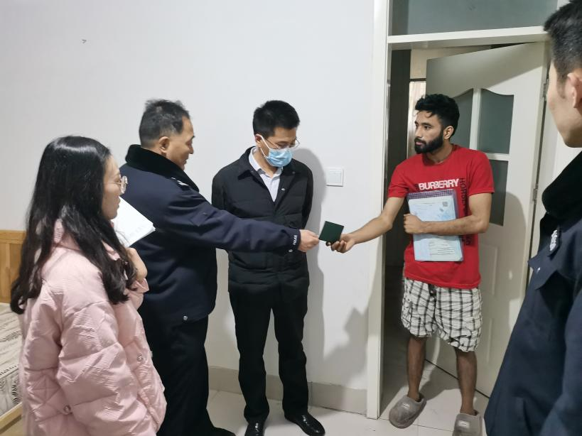 在留學生宿舍,走訪人員向留學生轉達了學院黨委和老師對留學生的關心關愛,并與他們親切交談,了解他們的學習生活情況和回國探親計劃,提醒他們要提升安全防范意識,注意用電、防火及出行安全。走訪過程中,民警對留學生居留許可有效期情況進行了核查,相關部門重點檢查了留學生宿舍消防設施與電器使用情況,并對安全隱患進行現場整改。