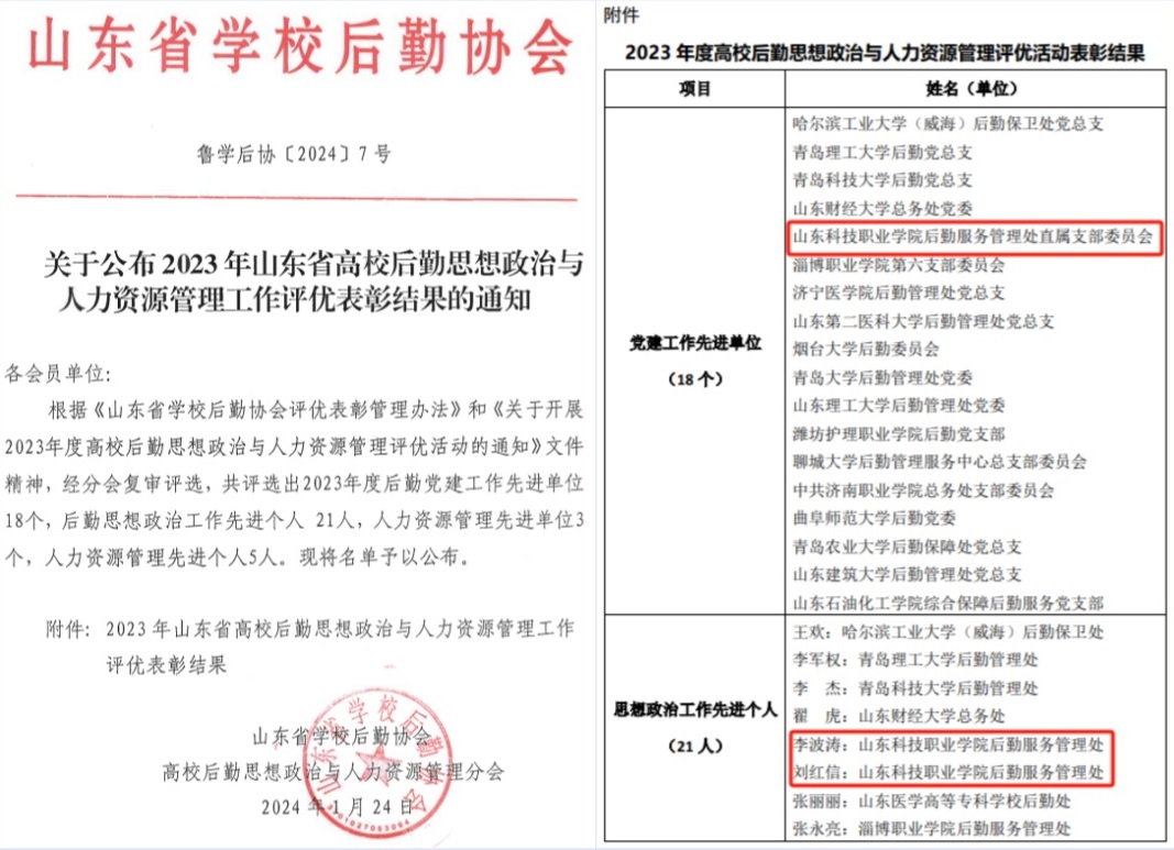 近日,山東省學(xué)校后勤協(xié)會印發(fā)《關(guān)于公布2023年山東省高校后勤思想政治與人力資源管理工作評優(yōu)表彰結(jié)果的通知》(魯學(xué)后協(xié)〔2024〕7號),后勤服務(wù)管理處直屬黨支部被評為“2023年度高校后勤黨建工作先進(jìn)單位”,劉紅信、李波濤兩位同志被評為“后勤思想政治工作先進(jìn)個人”。此次全省共評選出高校后勤黨建工作先進(jìn)單位18個、思想政治工作先進(jìn)個人21人。
