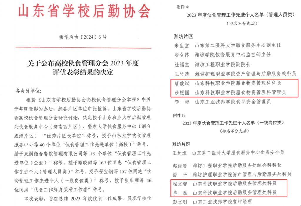 近日,山東省學(xué)校后勤協(xié)會發(fā)布通知,通報表彰2023年度山東省高校伙食管理先進(jìn)個人,我院后勤服務(wù)管理處4人榮獲表彰。其中唐俊斌、步銀國獲得(管理人員類)先進(jìn)個人,單磊、程文馨獲得(一線崗位類)先進(jìn)個人。