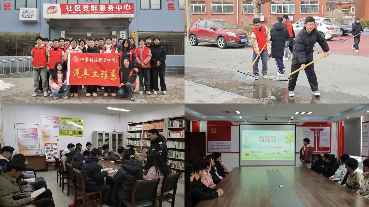 在垃圾分類主題宣講環節,志愿者們深入淺出地向居民普及垃圾分類知識,提醒大家在日常生活中做好垃圾分類,減少環境污染。大家還通過互動游戲,加深了對垃圾分類的理解和記憶。在汽車科普知識分享會環節,志愿者們向居民介紹汽車的安全駕駛、節能環保技術以及新能源汽車的發展趨勢。通過生動的講解和展示,居民們對汽車知識有了更深入的了解,激發了大家對綠色出行的興趣。在清理積雪環節,志愿者們拿著掃把、鐵鍬等工具,為社區道路進行積雪清理,保障居民出行安全。同學們在勞動過程中互相幫助,展現了汽車學子的良好精神風貌。