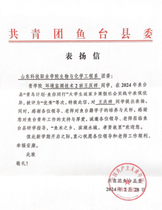 信中提到我校學(xué)生在2024年魚臺縣參與“青鳥計劃·魚你同行”大學(xué)生返家鄉(xiāng)寒假社會實踐中表現(xiàn)優(yōu)異,衷心感謝學(xué)校對魚臺青年工作的支持。