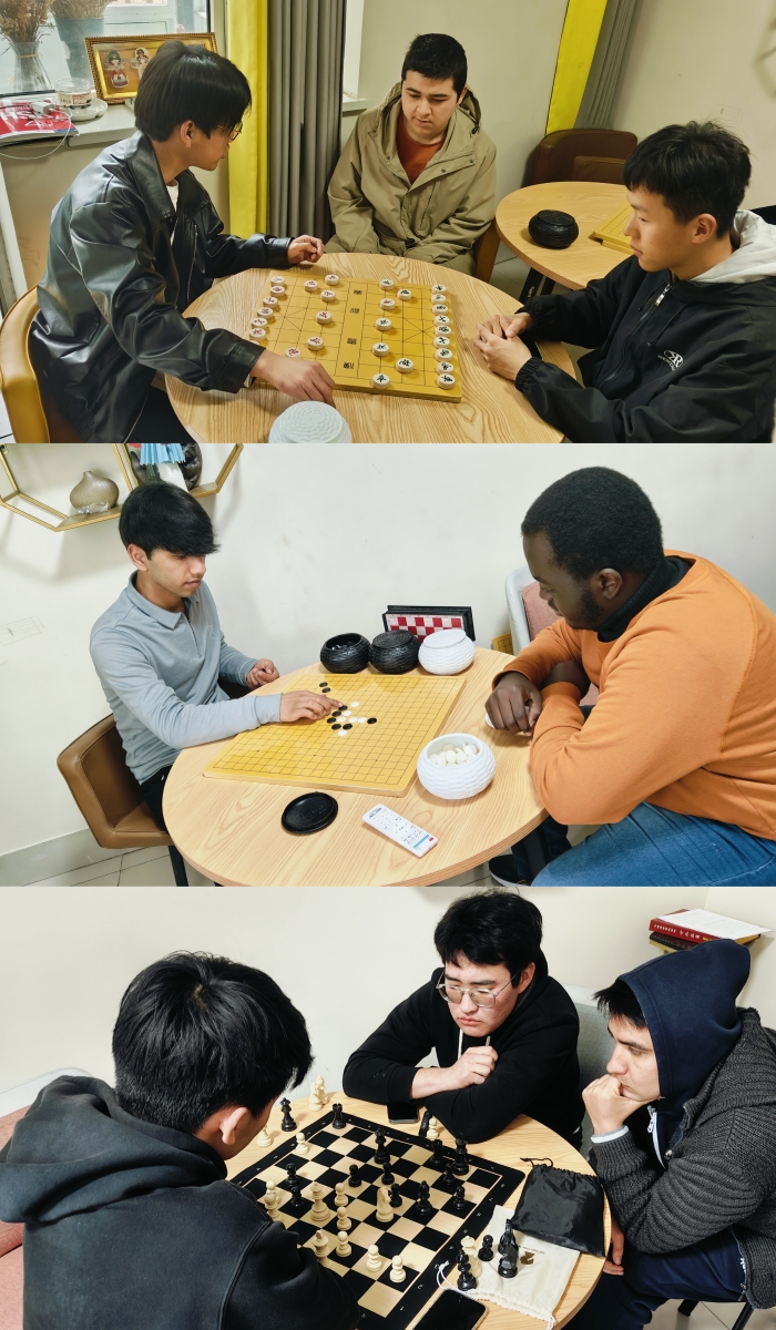 首先,同學們圍繞象棋、圍棋這兩種中國傳統(tǒng)棋種進行學習交流。國內學生介紹了象棋、圍棋的發(fā)展歷史、文化內涵和行棋規(guī)則,結合棋局實例講解對弈技巧,幫助留學生了解中華棋文化。留學生則介紹了國際象棋的相關知識和技巧,激發(fā)了國內學生的興趣。接下來,同學們分組對弈,進行象棋、圍棋和國際象棋的切磋,時而蹙眉沉思,時而篤定落子。顆顆棋子閃爍著智慧,方寸棋盤承載著友誼,同學們“棋”樂融融,體悟棋文化的魅力,收獲滿滿。