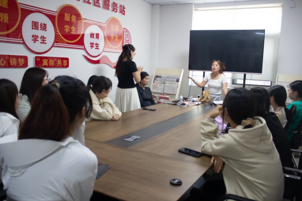 4月24日,機械工程系邀請紡織服裝系“我型我秀”專業社團進入一號公寓樓一站式社區,為學生進行美妝培訓活動。