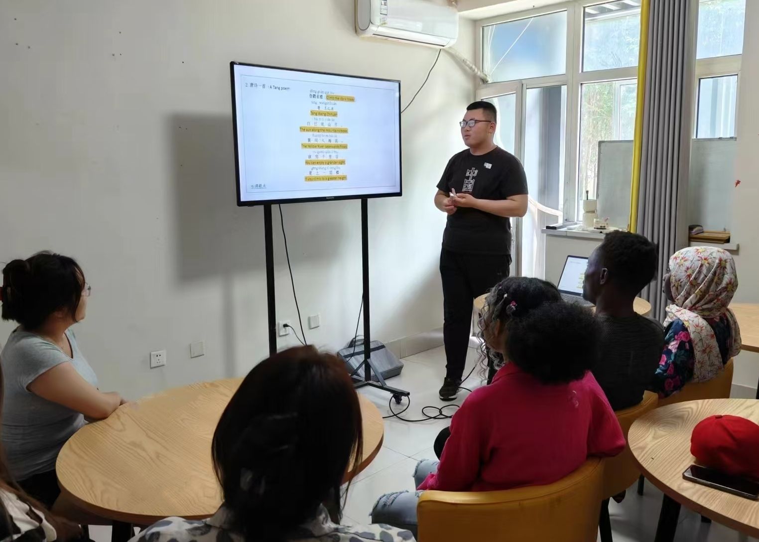 為促進中外文化交流,弘揚詩詞文化之美,5月22日下午,國際教育系于24號公寓文化體驗室開展“詩意相通,情系中外”古詩詞鑒賞活動,中外學生參加。