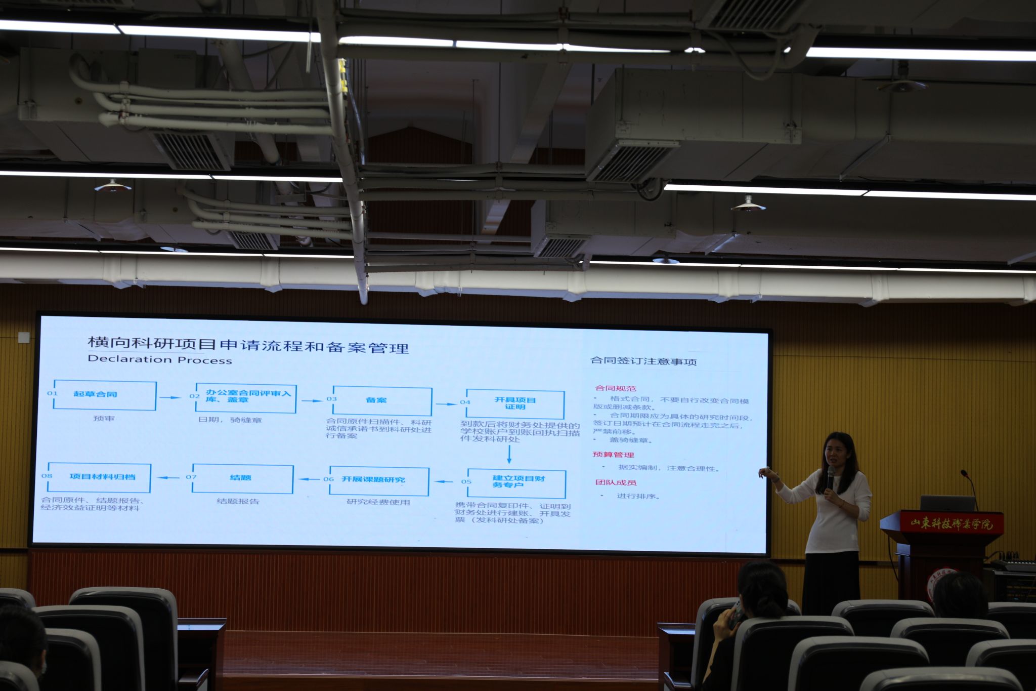 科研處副處長結合我校科研平臺和優勢,為老師們詳細講述了橫向科研項目的分類和區別,以及申請流程、備案管理、過程及結題管理等幾大過程,對老師們開展橫向科研理清了思路、提供了方法,并針對老師們開展橫向科研過程中存在的疑惑進行了解答。