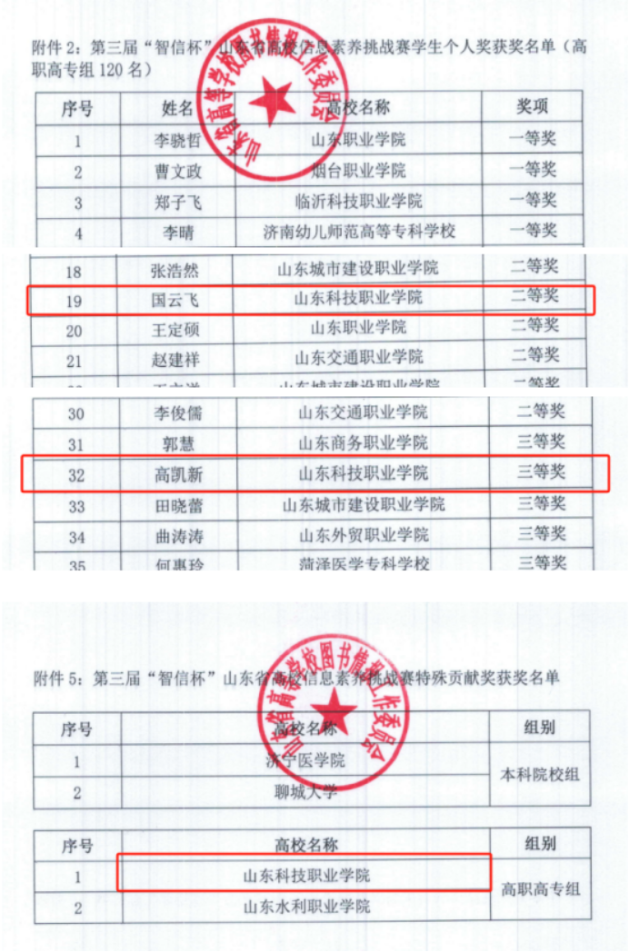 近日,由山東省高校圖書情報工作委員會主辦,山東省高校圖工委信息素質教育專業委員會、山東農業大學圖書館等單位協辦的第三屆“智信杯”山東省高校信息素養挑戰賽落下帷幕,來自全省82所院校的16591名學生報名參賽。我校喜獲佳績,學生榮獲山東省省賽二等獎1項、三等獎1項、優秀獎2項;學校獲大賽特殊貢獻獎,全省僅兩所高職院校榮獲該獎項。