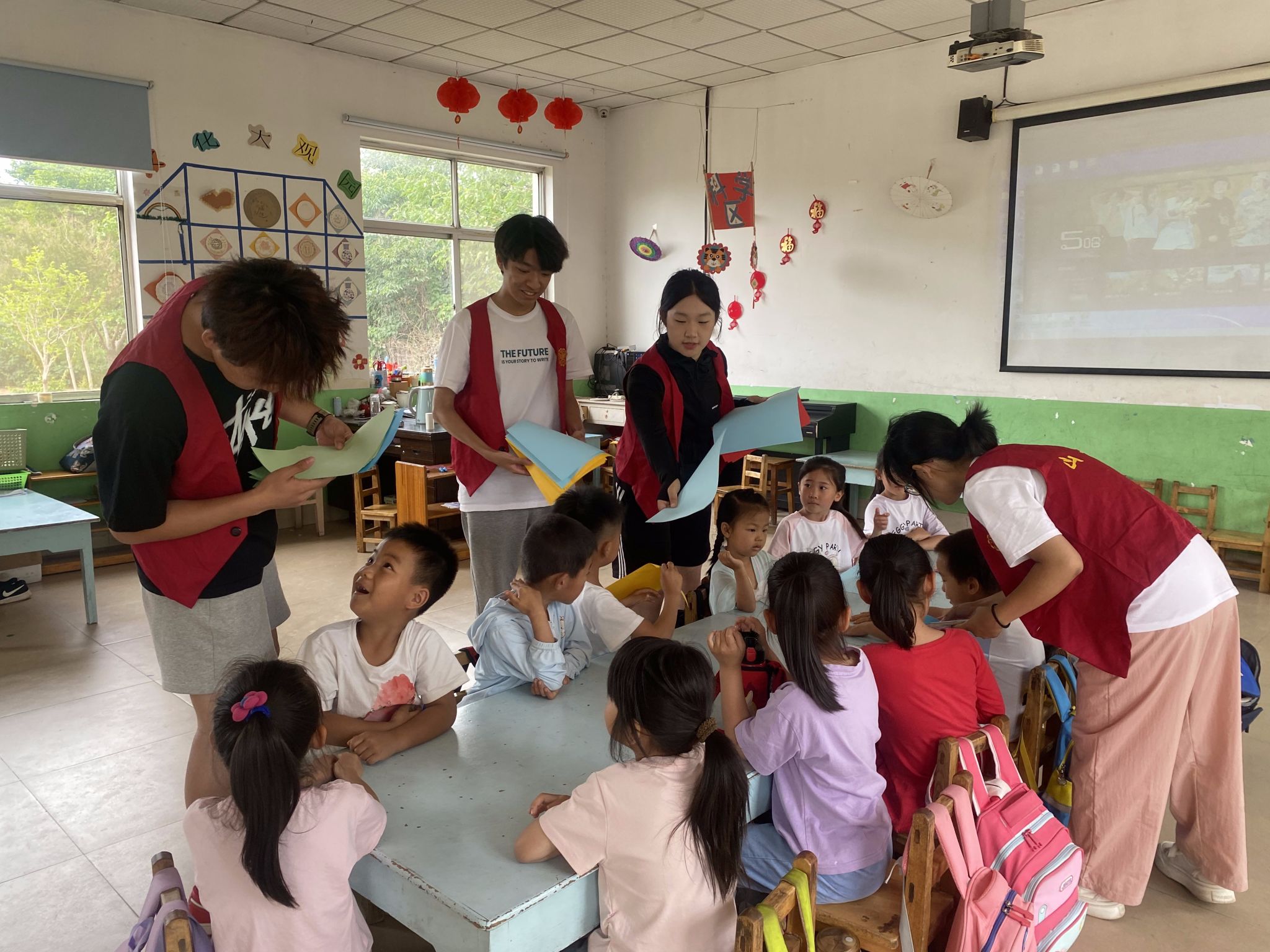 在活動中,志愿者們充分發揮各自的專長和優勢,帶領孩子們制作“龍舟”等折紙手工,通過折紙模擬賽龍舟的活動,讓孩子們走進折紙的世界,感受創意與樂趣,同時使他們感受著端午節傳統文化的濃厚氛圍。課后,志愿者們同孩子們進行“123木頭人”“蘿卜蹲”等互動小游戲,教室里洋溢著孩子們天真無邪的笑聲。?;萦變簣@的老師和孩子們對志愿者們的到來感到十分開心和激動。