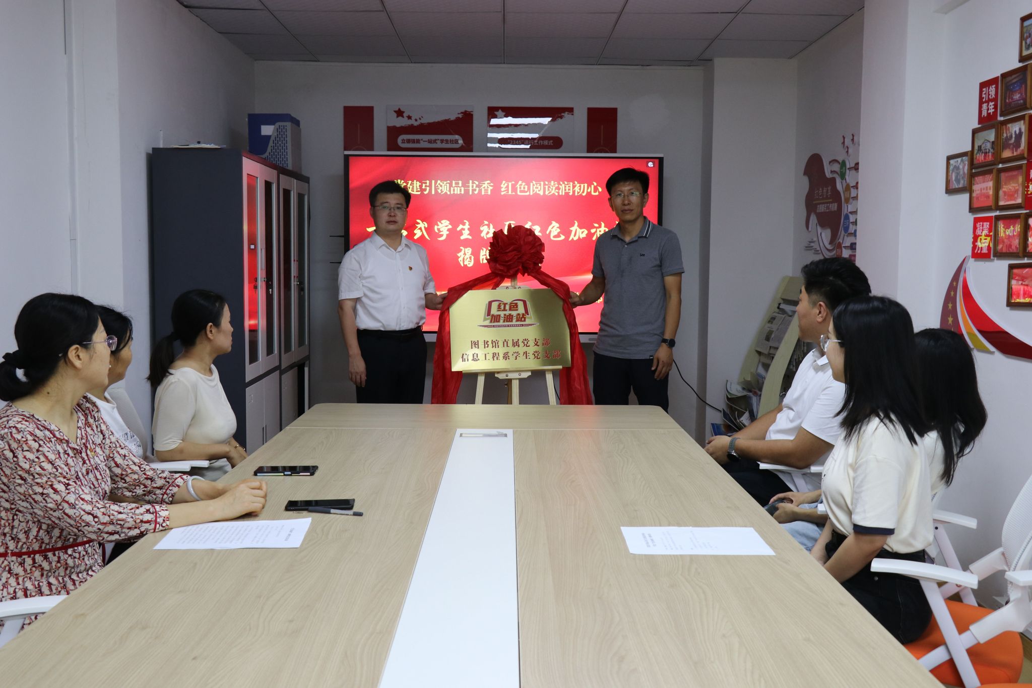 為進(jìn)一步發(fā)揮黨建工作服務(wù)效能,激發(fā)紅色引領(lǐng)的強(qiáng)大活力,7月1日下午,圖書(shū)館直屬黨支部與信息工程系學(xué)生黨支部在信息工程系一站式學(xué)生社區(qū)開(kāi)展了“黨建引領(lǐng)品書(shū)香 紅色閱讀潤(rùn)初心”暨“紅色加油站”揭牌啟動(dòng)儀式。圖書(shū)館直屬黨支部黨員、入黨積極分子、信息工程系學(xué)生黨支部師生代表參加活動(dòng)。
