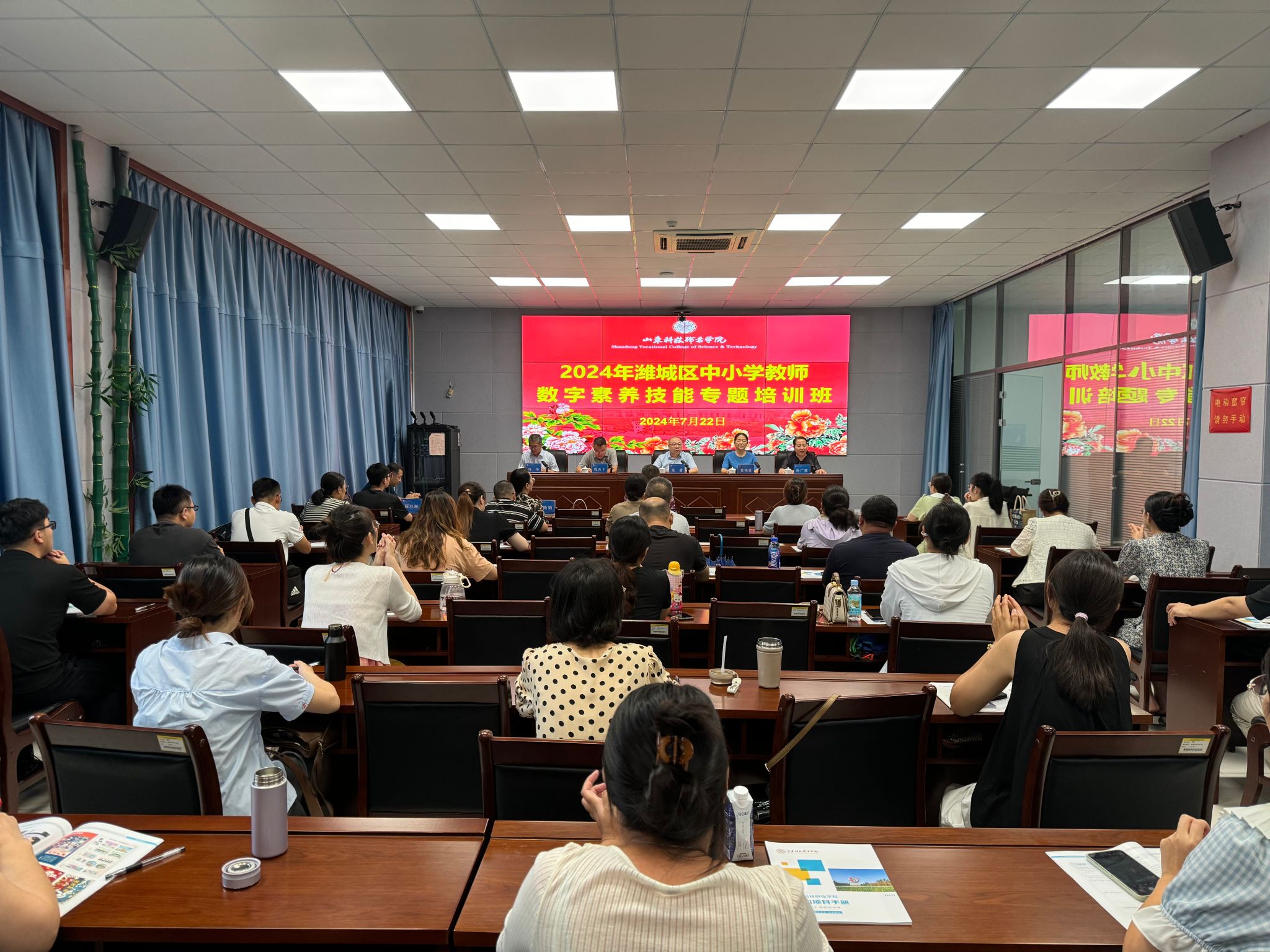 7月22日,2024年濰城區中小學教師數字素養技能專題培訓班在我校舉行。濰城區委宣傳部、區互聯網輿情中心主任張贇做培訓動員講話,學校黨委委員、副校長徐曉雁致辭。開班儀式由繼續教育與培訓部負責人主持,濰城區教育和體育局信息中心主任魏兆豐、濰城區中小學學科骨干教師以及教學管理人員等70余人參加。