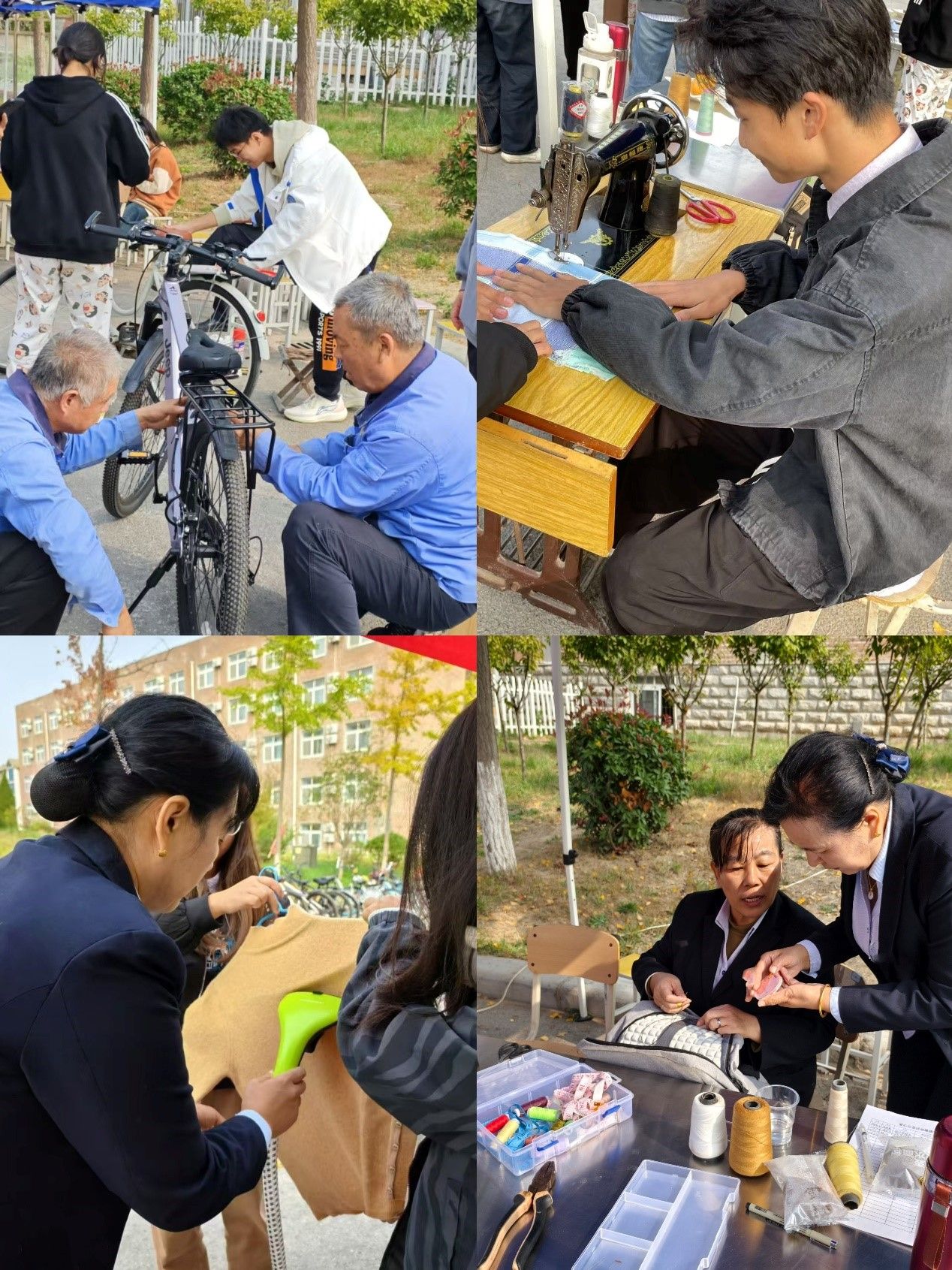 此次活動形式多樣,涵蓋了修理自行車、縫補衣物、熨燙衣服等多個項目。在自行車修理區,維修師傅耐心地為同學們檢修自行車;縫補衣物區的工作人員將學生的破損衣物縫補一新;熨燙衣服區的志愿者將每一件衣物熨燙平整。活動現場氣氛活躍溫馨,吸引了眾多師生參與。
