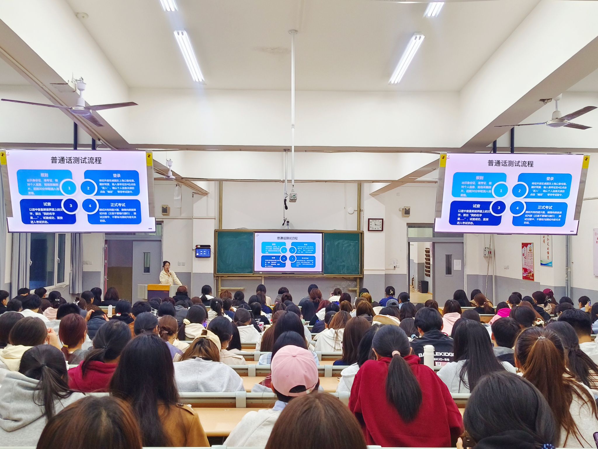 培訓過程中,輔導員詳細介紹了考試流程、內容、評分標準及注意事項,結合往屆真題對學生進行音節字詞、短文朗讀、命題說話等方面的專項訓練,通過跟讀、糾錯等互動環節幫助學生提升應試技巧。培訓現場氣氛熱烈,學生在字詞發音、邏輯表達、文化素養等方面均取得了一定進步,提升了應試信心。
