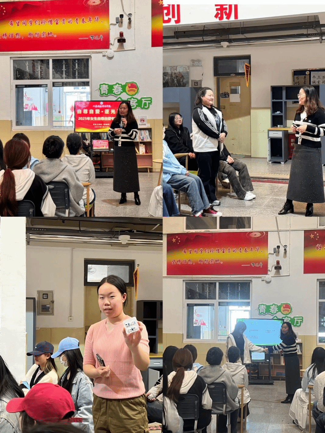 此次活動由來自基礎部的輔導員方潔老師擔任主講,她結合心理學理論與真實案例,從“立身之本—自尊自愛的重要性;成長之源—自尊自愛的起點;護身之盾—自尊自愛的保障”三方面跟大家分享。她通過互動問答、情景模擬等形式,強調自尊自愛是女性成長的核心基石。引導學生在人際交往中建立邊界意識,在壓力中培育理性思維和積極心態,活動現場氣氛熱烈,贏得了學生陣陣掌聲。