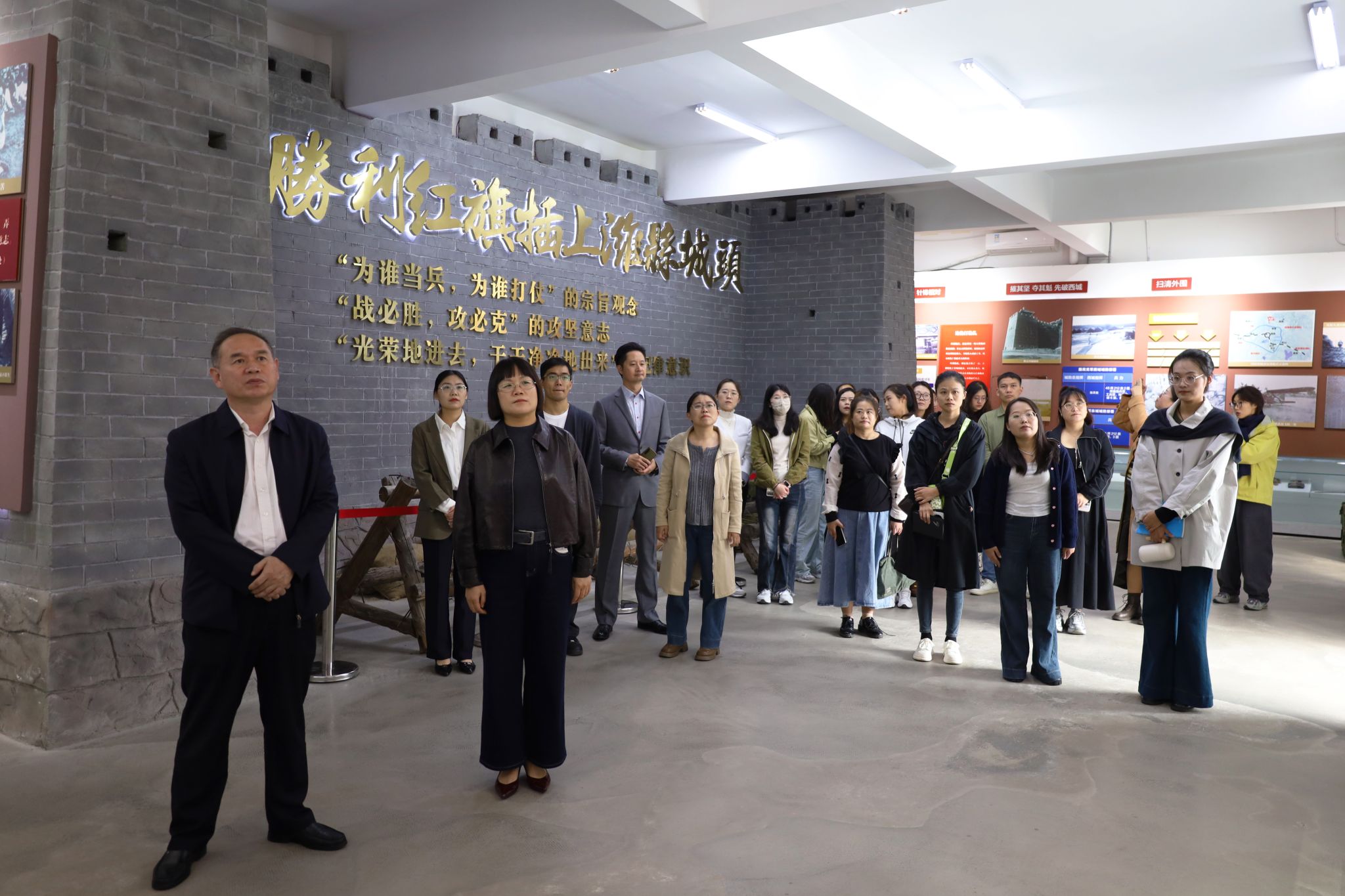 活動分為兩個階段進行,第一階段為實地參觀研學,全體教師在講解員的引導下,集中參觀了濰縣戰役紀念館。展覽以“把勝利紅旗插在濰縣城頭”為主線,系統再現了那段烽火連天、英勇奮戰的光輝歷史。館內豐富的實物陳列、生動的場景復原,以及“戰士墻”上鐫刻的參戰將士與“將星閃耀”板塊展示的英模事跡,深深觸動了在場的每一位教師。參觀尾聲,全體黨員教師在黨旗下莊嚴宣誓,用鏗鏘誓言傳承革命先輩遺志,將參觀研學的情感共鳴轉化為深耕思政課堂的不懈動力,為后續愛國和國防教育思政課備課積累了兼具歷史深度與教育溫度的鮮活素材。