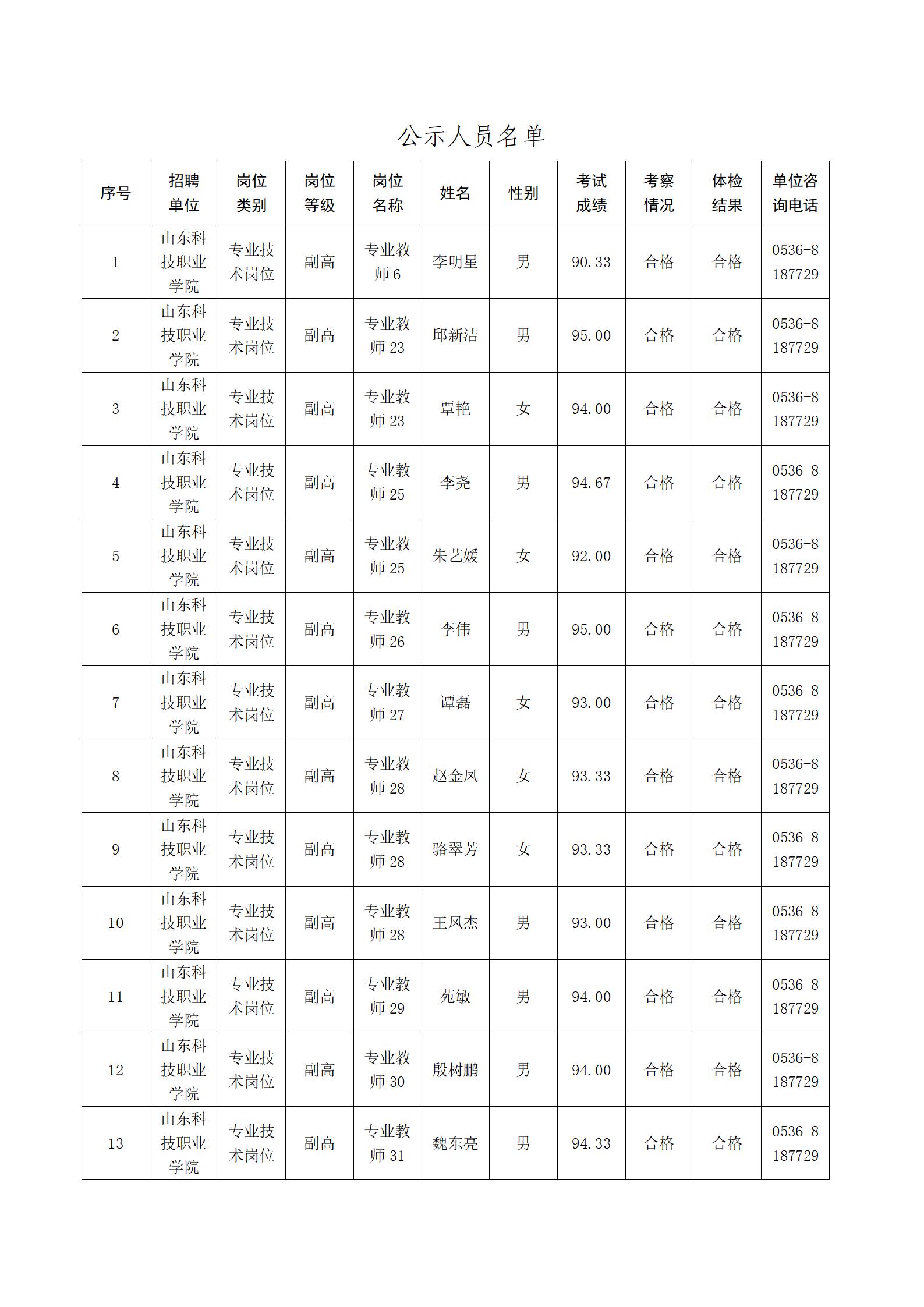 根據省委組織部、省人力資源和社會保障廳《關于印發2023年度省屬事業單位公開招聘工作實施方案的通知》(魯人社發〔2022〕23號)等相關規定,按照崗位招聘計劃,山東科技職業學院組織完成了部分崗位公開招聘考試、考察、體檢等工作,現對擬聘用人員進行公示。公示期為7個工作日,自2023年9月22日至10月8日(不含節假日)。公示期間,如對公示人選有異議,請及時向山東科技職業學院反映。