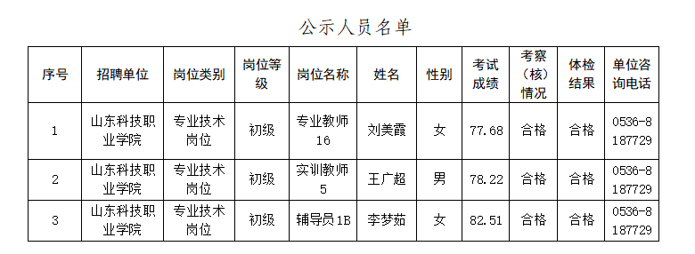根據(jù)省委組織部、省人力資源社會(huì)保障廳《關(guān)于印發(fā)2024年度省屬事業(yè)單位公開(kāi)招聘工作實(shí)施方案的通知》(魯人社發(fā)〔2023〕14號(hào))等相關(guān)規(guī)定,按照崗位招聘計(jì)劃,山東科技職業(yè)學(xué)院組織完成了部分崗位公開(kāi)招聘考試、考察、體檢等工作,現(xiàn)對(duì)第三批擬聘用人員進(jìn)行公示。公示期為7個(gè)工作日,自2024年8月13日至8月21日(不含節(jié)假日)。公示期間,如對(duì)公示人選有異議,請(qǐng)及時(shí)向山東科技職業(yè)學(xué)院反映。